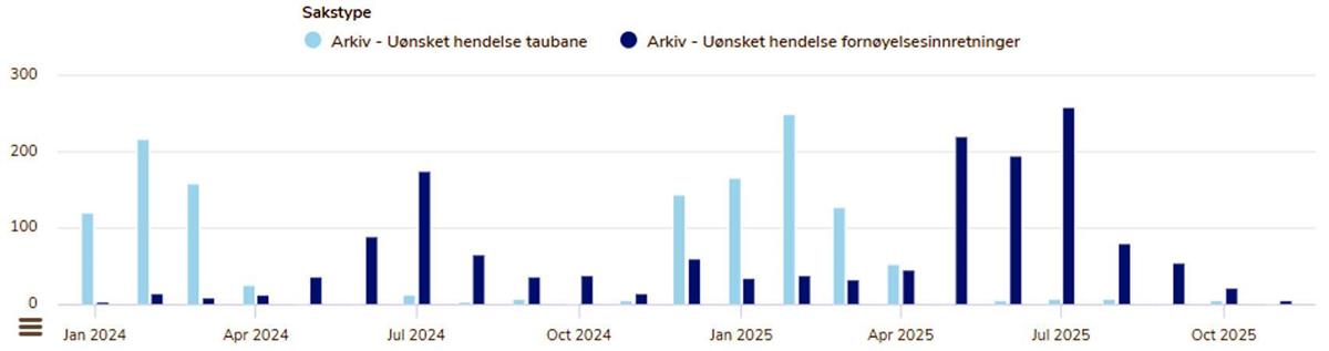 Uønskede hendelser i fornøyelsesinnretninger og taubaner fra januar 2024 til oktober 2025.Grafen viser naturlige sesongvise svingninger for taubaner og fornøyelsesinnretninger, samt en gradvis øking i antallet innrapporterte hendelser fra i fjor til i år. Dette er positivt. Flere hendelser gir oss mer grunnlag for å kunne bruke statistikken i sikkerhetsarbeidet vårt.