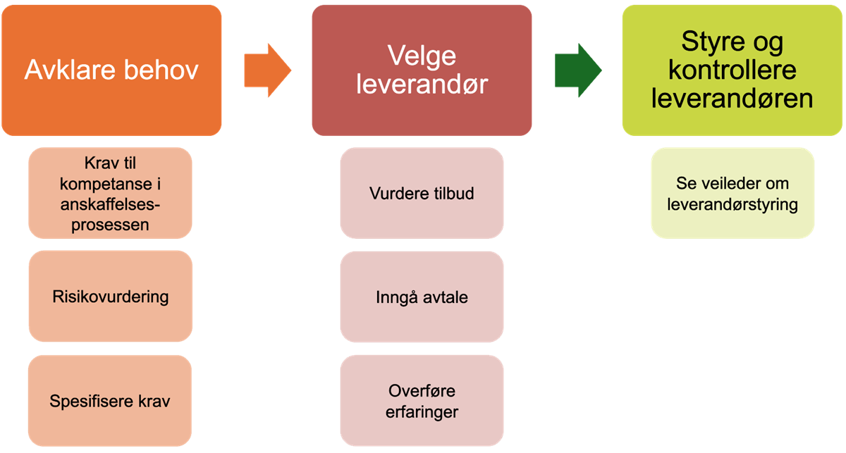 Forskriftene stiller ikke krav til anskaffelser direkte. Krav til hvordan anskaffelser og avtaler skal håndteres, kan leses ut fra kravene som stilles til styring og kontroll av leverandører.
