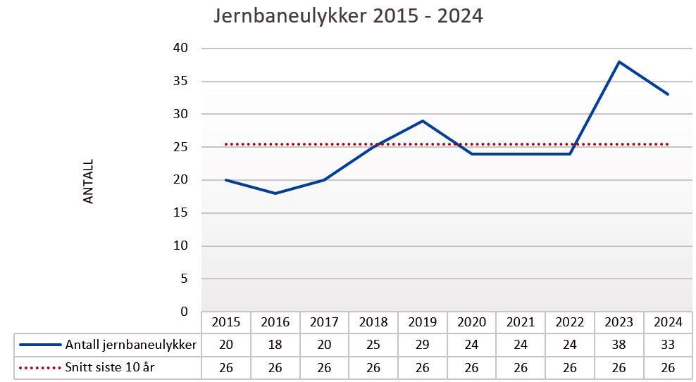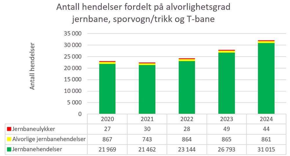 Opplysninger og tall i denne rapporten er basert på rapporterte hendelser fra virksomhetene etter gjeldende regelverk og presiseringen av definisjonen på jernbaneulykker, alvorlige jernbanehendelser og jernbanehendelser. Begrepet jernbaneulykke samsvarer med indikatorer fra ERA. Den totale rapporteringen av uønskede hendelser har økt cirka 10 prosent fra 2023 til 2024. I 2024 fikk vi inn cirka 45 000 rapporter om uønskede hendelser med jernbane, T-bane og sporvogn/trikk. Dette tallet inkluderer dobbeltrapportering, dyrepåkjørsler og selvmord. Videre i denne rapporten er dyrepåkjørsler og dobbelrapportering fjernet fra statistikken.