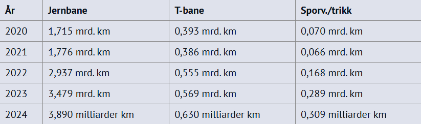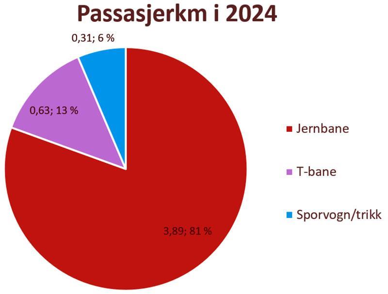 Tabell 1 – oversikt over togkilometer for 2020-2024Figur 2 (under) viser at 81 prosent av passasjerkilometer er på jernbanen. Jernbane, T-bane og sporvogn/trikk har alle økt i passasjerkilometer. Det vil si at antall passasjerer har økt.