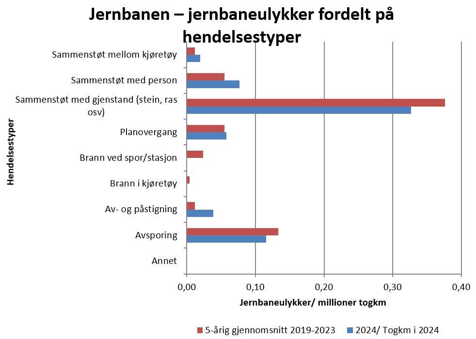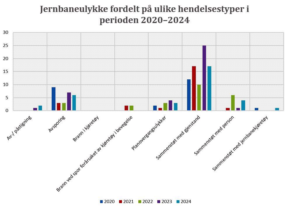 Figur 6 – jernbaneulykker fordelt på hendelsestyper i perioden 2020–2024.Figur 6 viser jernbaneulykker fordelt på hendelsestyper i 2020–2024. 21 av ulykkene i 2024 involverte passasjertog, fem involverte godstog og 7 andre typer tog. 17 av ulykkene er knyttet til sammenstøt med gjenstand, hvorav 14 er nedriving av kjøreledning. Færre sammenstøt med gjenstand i 2024 skyldes færre hendelser med kjøreledninger som har blitt revet ned. I en av ulykkene i kategorien «sammenstøt med gjenstand» omkom lokomotivføreren på grunn av sammenstøt mellom persontog og steinras på Nordlandsbanen.
