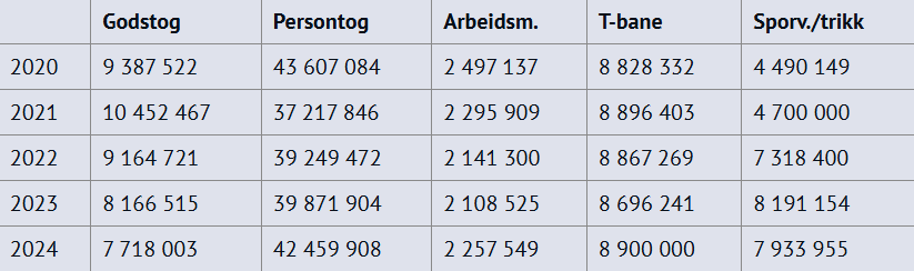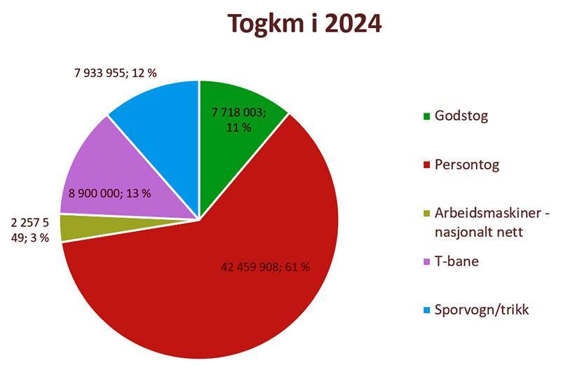 Figur 1 – togkilometer i 2024.Figur 1 viser at persontog har 61 prosent av alle togkilometerne i Norge og dominerer antall kjørte togkilometer i 2024. Godstog har 11 prosent, T-bane har 13 prosent og sporvogn/trikk har 12 prosent. Trafikktallene for 2020–2024 vises i Tabell 1 og Tabell 2. Togkilometer for arbeidsmaskiner er beregnet ut ifra antall driftstimer