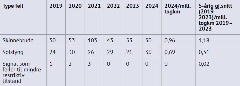 Tallene i tabell 5 (under) er basert på innrapporteringen fra Bane NOR SF og gjelder for det nasjonale jernbanenettet.