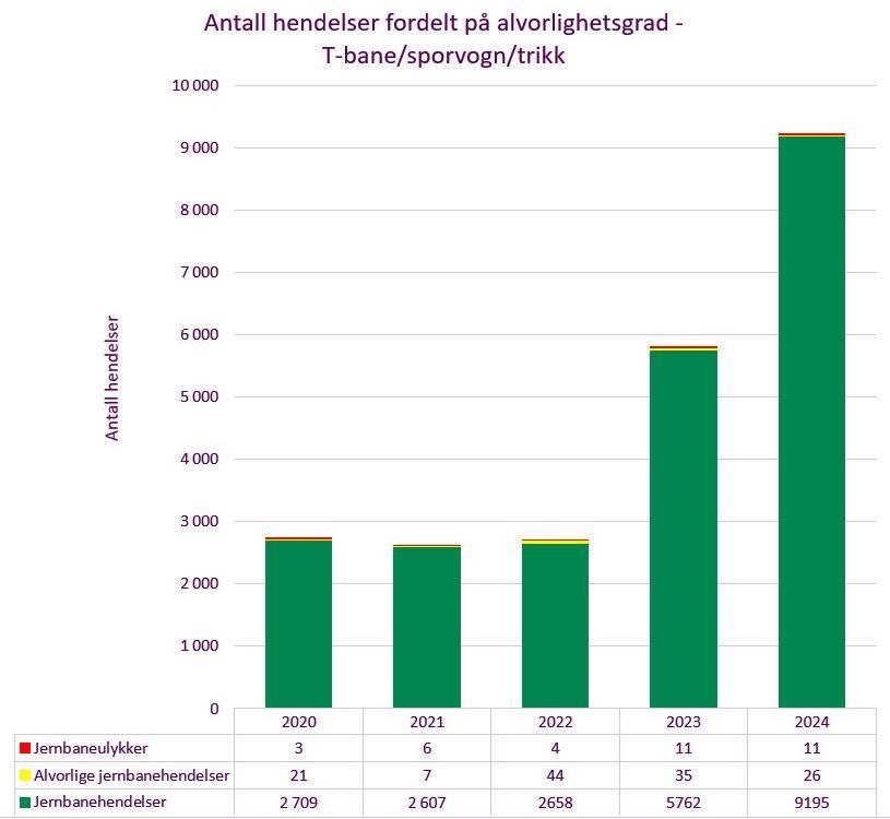 For T-bane/sporvogn/trikk i 2024 var det to ulykker der to tredjepersoner omkom som følge av sammenstøt mellom personer i sporet og jernbanekjøretøy Det var én passasjer som ble alvorlig skadet som følge av fall om bord. De resterende jernbaneulykkene i 2024 skyldes stopp i trafikken over 6 timer eller materielle skader over 1,5 millioner kroner.