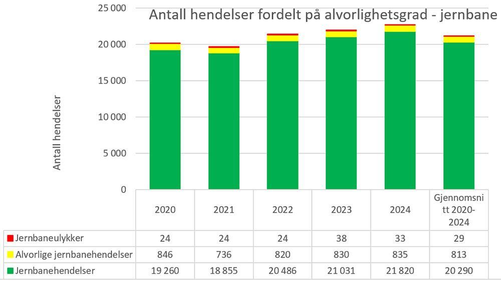 Figur 3 – totalt antall innrapporterte hendelser (jernbane, sporvogn/trikk og T-bane) i 2020–2024.Figur 3 viser at rapportering for jernbanehendelser samlet for hele bransjen har økt, mens antall alvorlige jernbanehendelser er tilnærmet lik i perioden 2022–2024. Det er noen færre jernbaneulykker i 2024 enn i 2023, men begge årene ligger over gjennomsnittet for perioden 2020–2024.